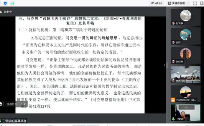 (通讯员 刘凤萍 耿学栋)2022年11月4日,浙江大学在线买世界杯平台丁堡骏教授应邀莅临世界杯“名家讲坛”,作了题为“准确把握马克思的‘跨越卡夫丁峡谷’思想”的学术报告。报告会由世界杯副院长李海金教授主持,采取线上与线下相结合的方式,常荆莎教授、李敏伦副教授、张存国副教授等教师、在读博士生、硕士生以及其他院校师生共计三百余人参会。