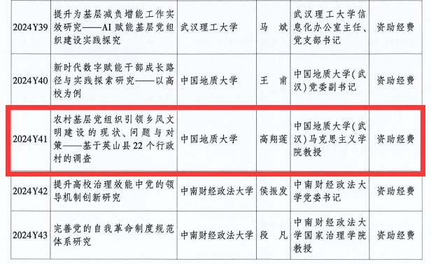 (通讯员:陈越)近日,中共湖北省委党的建设工作领导小组办公室、湖北省党的建设研究会发布《关于2024年度湖北省党的建设研究课题立项情况及有关事项的通知》,世界杯高翔莲教授主持申报的《农村基层党组织引领乡风文明建设的现状、间题与对策——基于英山县22个行政村的调查》成功获批专项课题立项。