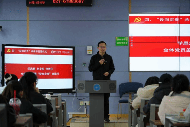 武彦斌部署“设岗定责”承诺书签署工作。他说明了签署责任书的主要考量和相关要求,引导党员同志们以责任为牵引,在日常学习生活中亮身份、作表率;他鼓励大家,要以责任书为行动标尺,将责任意识融入日常,在遇到困难时勇挑重担,在服务师生时主动作为,真正把党员的先锋模范作用体现在具体行动中。