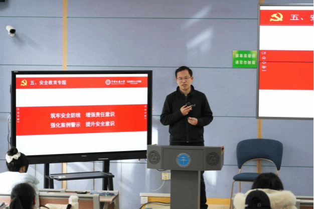 武彦斌开展安全教育和案例警示。他结合学校发布的安全警示案例,从网络色情诱导骗局、刷单返利骗局、非正规软件链接骗局等方面进行警示教育;同时,他强调党员要当好自身安全“第一责任人”,重点提醒大家警惕流感传播风险、规范用电用水行为,在日常生活学习中做安全管理的先行者和示范者。