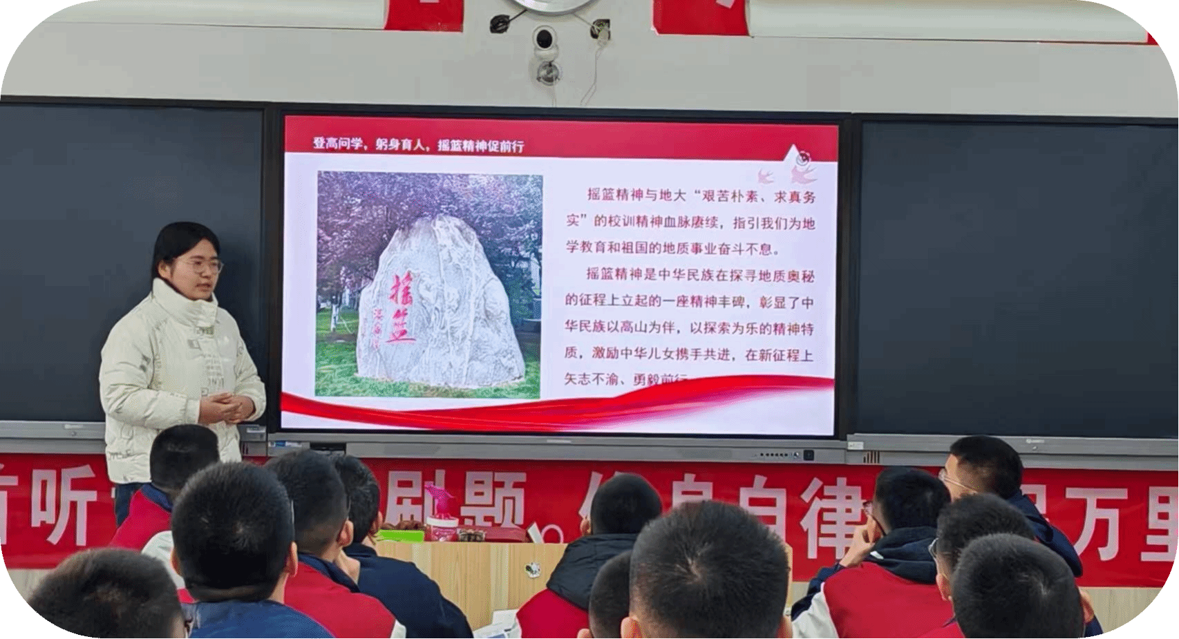 然后,讲述摇篮精神的力行悟道,山越高,意志愈坚;岭越远,胸怀愈宽。一个不畏艰难困苦的人,一定会到达光辉的顶点,只有在实习实践过程中见识真问题、思考真问题、解决真问题,一步一个脚印,脚踏实地,知行合一,才能靠近真理之光;摇篮精神中那份赤诚奉献、蔚为国用深深打动着人心,最后,辛汪洋同学将与大家分享摇篮精神的时代意义与价值,摇篮精神托举着一代代地大人在未来的道路上踽踽独行,同时也在中华民族精神征程中立起一座精神丰碑,激励着青年矢志不渝、勇往直前。