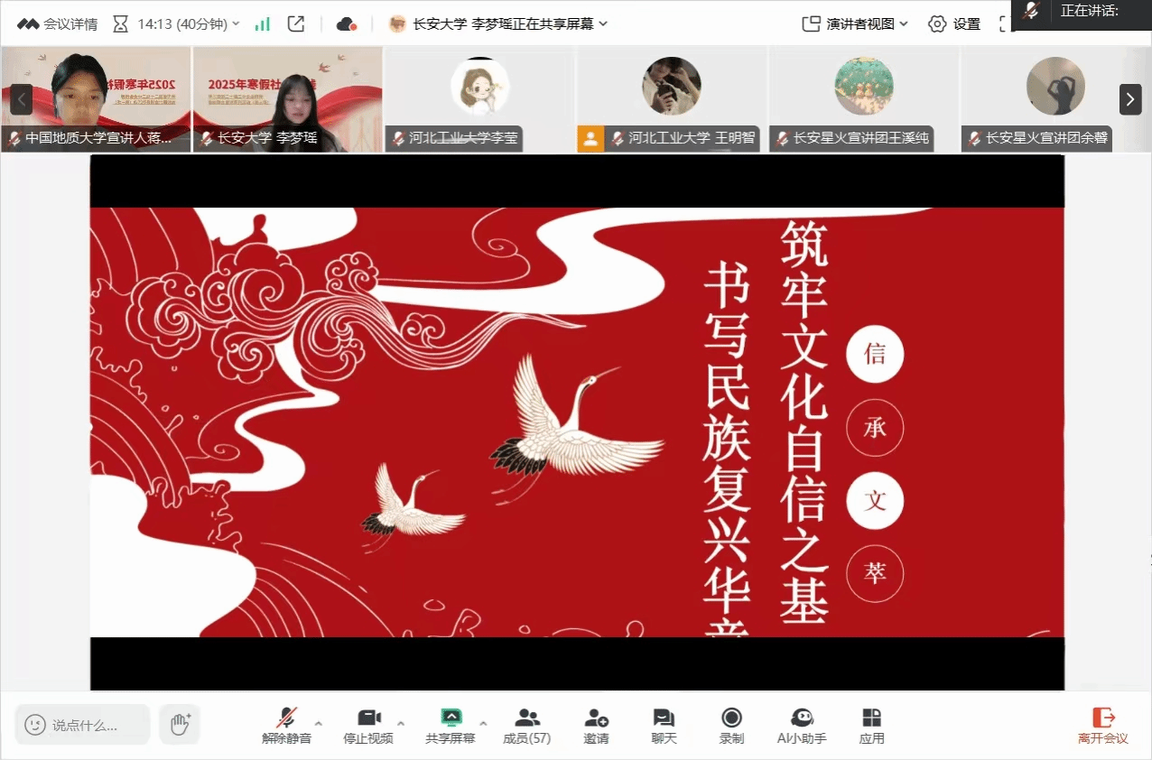 宣讲结束后,同学们纷纷表示,通过此次活动,他们对文化自信有了更加全面和深入的理解,也更加坚定了为实现中华民族伟大复兴的中国梦贡献青春力量的决心在线买世界杯平台(武汉)在线买世界杯平台“信承文萃”团队的此次线上宣讲活动,不仅为同学们提供了一个学习和交流的平台,更是一次精神的洗礼和思想的升华。在新时代的征程上,让我们携手同行,共同筑牢文化自信之基,书写民族复兴的华章。