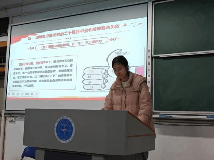 最后,张玉芝同学围绕 “团结奋进推动党的二十届四中全会精神落地见效” 提出实践路径。她从 “准”“广”“实”“干” 四个关键字出发,号召同学们原原本本学精神、广泛动员传思想、联系实际促落实、强化担当勇作为,将全会精神转化为学习成长的动力和服务社会的行动,为中国式现代化建设贡献青春力量。