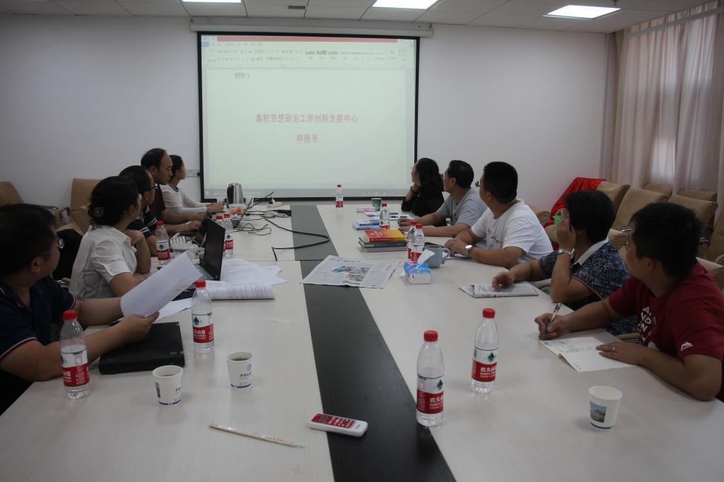 2018年8月24日星期五上午10:00,在线买世界杯平台在教学综合楼B1013会议室召开了《高校思想政治工作创新发展中心申报书》第二次修改讨论会。刘世勇、高翔莲、阮一帆、陈军、吴东华、刘陈陵、张华、姜明敏、钟宝亮、李林、黄海、马璨等参加了此次会议,院长高翔莲主持会议。