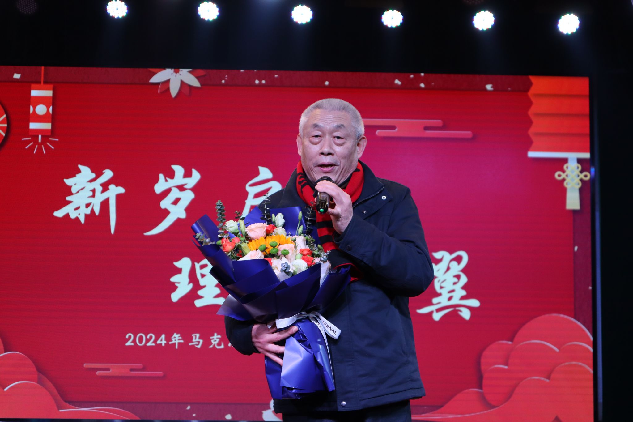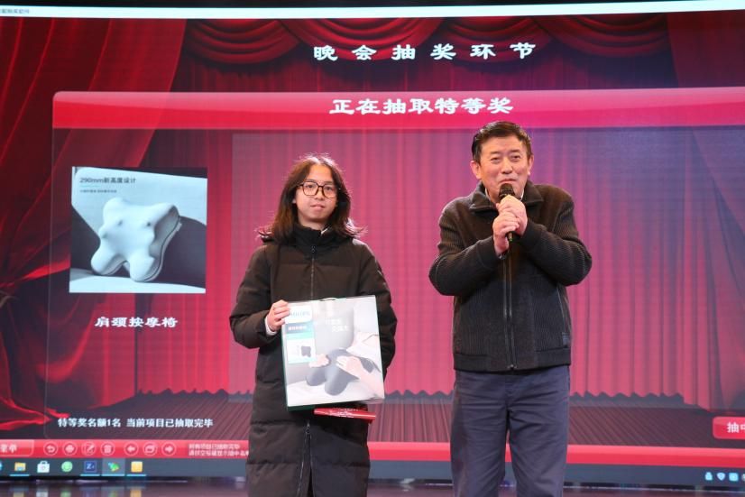 第三轮扫码抽奖。在新年大奖一等奖抽奖环节,2023级学生倪文彬同学最终成为获奖者,原校党委书记郝翔老师颁奖并现场献唱一曲。