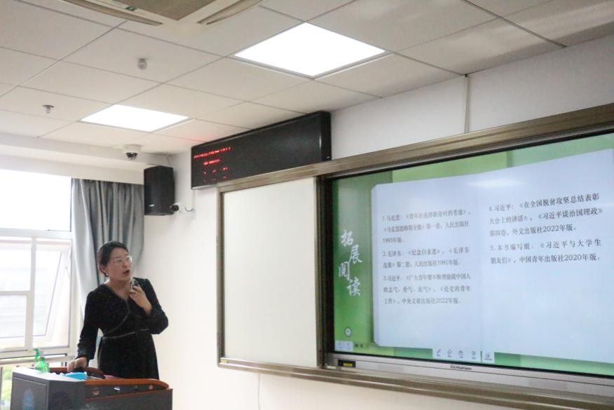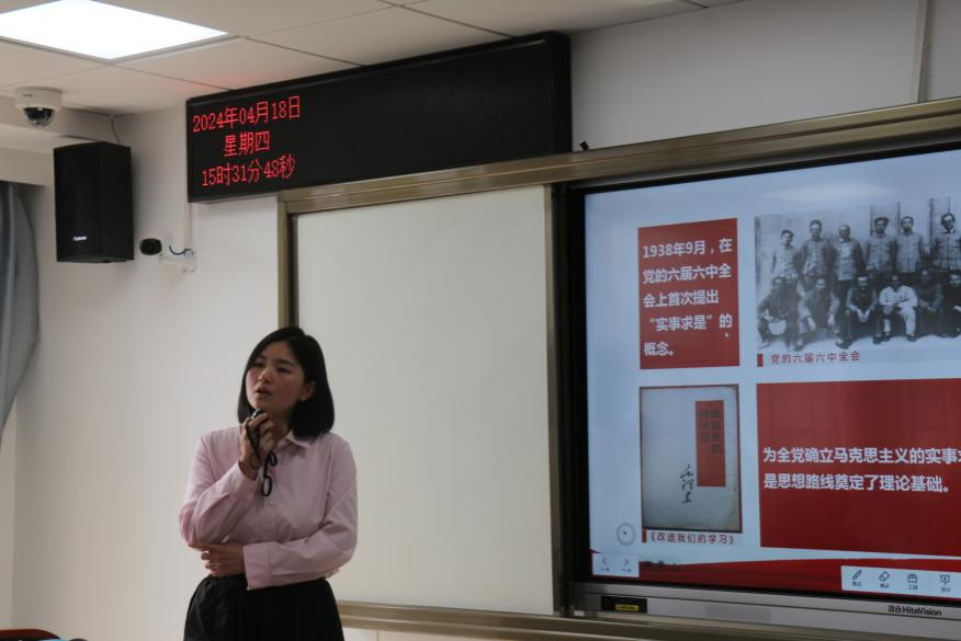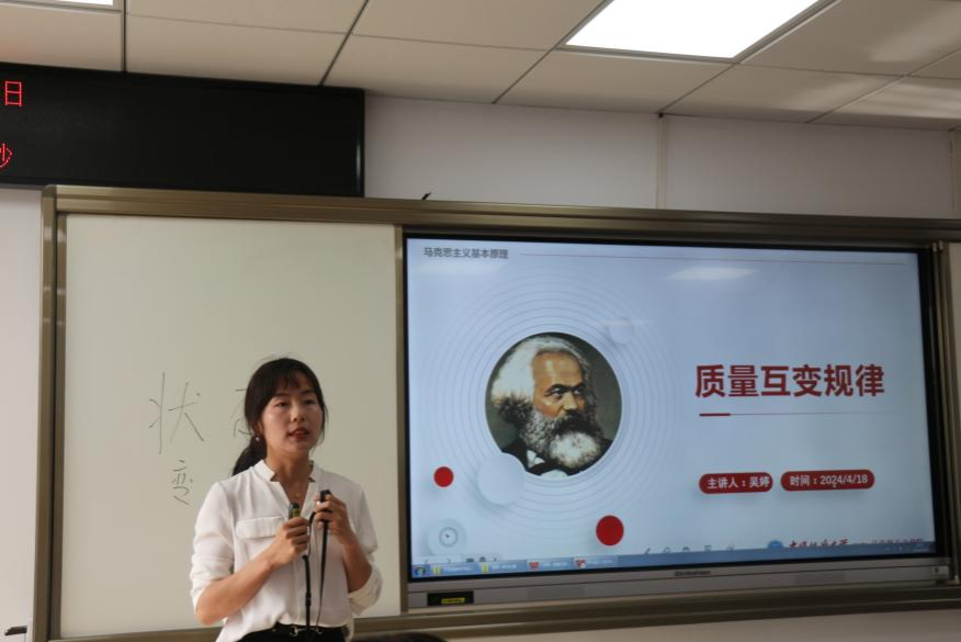 在比赛环节,学院5位青年思政课教师曹阳、何帅波、李胜蓝、罗丽娅、吴婷,分别以“尊重和传承中华民族历史文化”“辛亥革命与中华民国的建立”“‘实事求是’的思想路线”“正确认识人的本质”“质量互变规律”为主题,进行了教学展示。