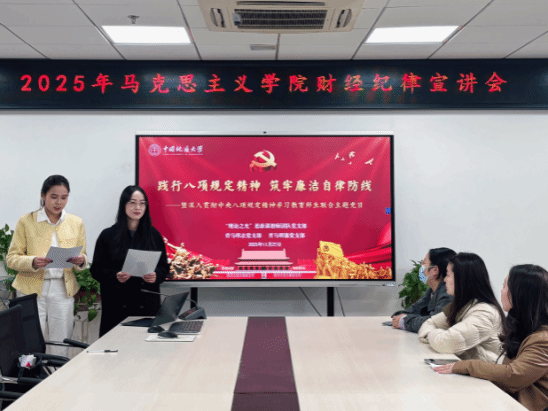 2025年11月27日下午,“理论之光”党支部联合结对领航的青马明志、青马明德学生党支部,于东区教学综合楼B1013召开“践行八项规定精神 筑牢廉洁自律防线——暨深入贯彻中央八项规定精神学习教育师生联合主题党日”活动。活动由专题党课、心得交流、视频学习、总结致辞等环节构成,活动由“理论之光”思政课教师团队党支部书记李蔚然与青马明德党支部委员李书乐主持,40余名师生党员齐聚一堂,共同筑牢廉洁自律的思想防线。