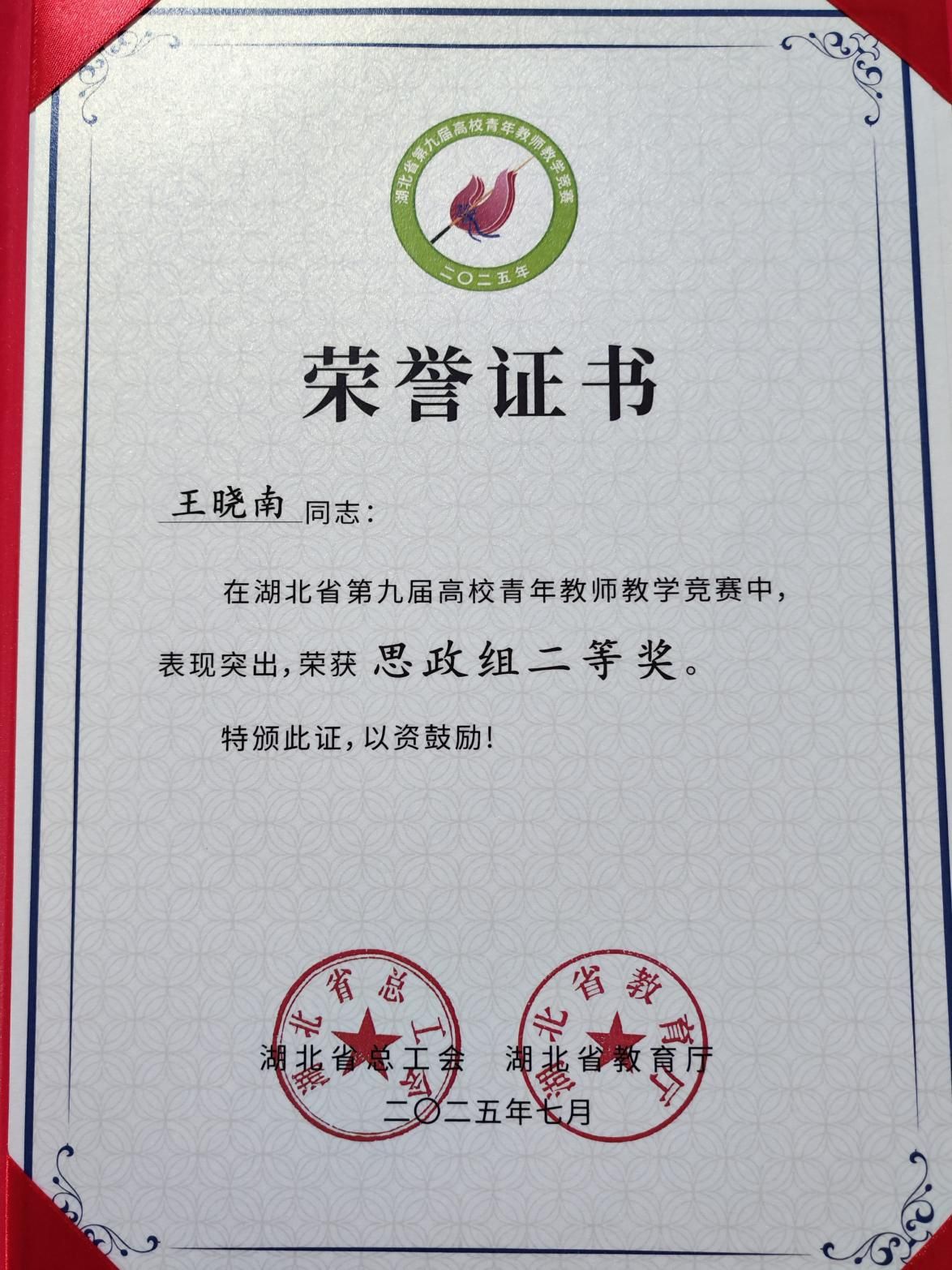 在本次竞赛中,世界杯青年教师王晓南经过教学设计、教学展示、教学反思三个环节的比拼,表现优异,获得思政组二等奖第一名的佳绩。这是世界杯教师在湖北省高校青年教师教学竞赛中取得的最好成绩,实现了历史性突破。