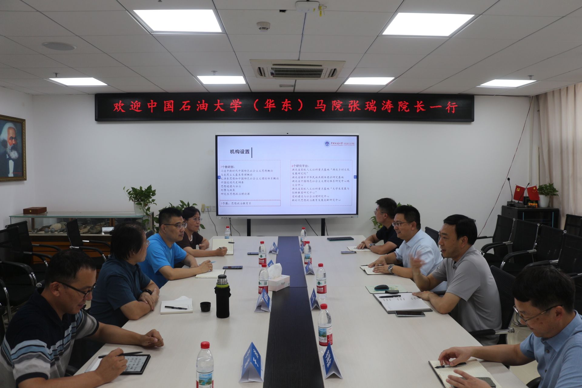 阮一帆院长对张瑞涛院长一行来校表示欢迎,重点介绍了世界杯的发展历程、机构设置、师资队伍、思政课建设、学院发展思路、省级重点马院建设和人才培养等特色经验。石油大学张瑞涛院长一行也分别介绍了马院的发展思路以及学科特色上的探索经验。