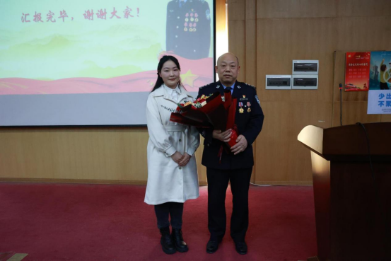 授课结束后,学生党员代表,青马明志党支部组织委员陈雅文同志向胡永鹏警官献花,向英模学习、致敬。